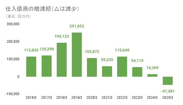 仕入債務の増減額は2025年3月期を除きプラスで推移しています。仕入債務は信用保証買掛金などの買掛金のことを示し、仕入債務は貸借対照表における売上債権の負債の側面であるため債権同様に、仕入債務の増額=景況感を示す指標と言えます。景況感を示す性質のある仕入債務の増減額が2025年3月期にマイナスになりました。つまり、債務の増加フェーズから返済フェーズに入ったということです。もちろん一過性である可能性は高いですが、それでもジャックスにおいて業績拡大に一服感があるとも感じられます