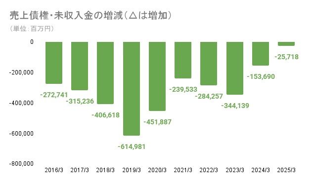 売上債権の増減額はダイレクトに業績の変化を表し、増加(表記上はマイナス)は景気の良さを示して減少(表記上はプラス)は景気の停滞感を示します。売上債権は2019年3月期と2020年3月期に大きく増加したものの、2021年3月期からコロナウィルスの影響による経済停滞の本格化が売上債権の増加の足かせとなり、増加額は小さくなりました。その後は2023年までゆっくりと増加傾向を見せましたが、2024年3月期には一部加盟店での利上げ(値上げ)を行ったことや後払いサービス事業の一部を停止したことや日銀による政策金利の上昇などで今に至るまで売上債権は減少傾向を見せています。