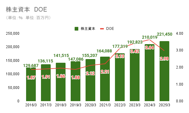ジャックスは直近10年は毎年黒字の安定的な収益構造をしており、株主還元も配当性向30%前後と余裕のある還元をしています。その結果、株主資本は積み重なり右肩上がりです。株主資本が右肩上がりにある場合はDOEを一定にすると連動して配当金額も増加します。ジャックスはDOE3%以上を株主還元方針として採用しており、今後も安定して黒字を維持することができれば、長期的には高増配期待低減配リスクを実現できると考えられます。