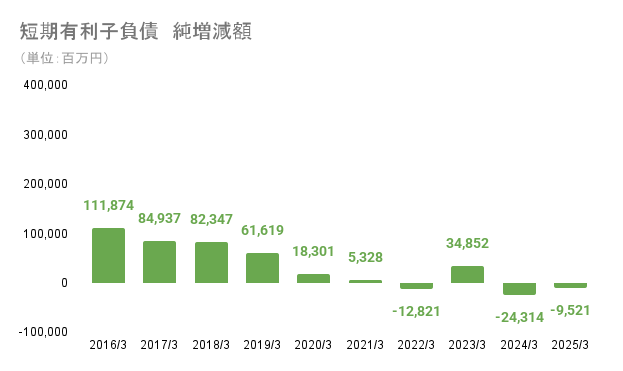 本記事では「短期有利子負債の純増減額」に関して、財務キャッシュフローにおける「短期借入金の純増減額」と「コマーシャルペーパーの純増減額」の合計と定義しています。