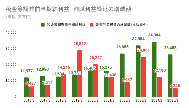 税金等調整前当期純利益波打ちながらも右肩上がりの傾向があります。特に2022年3月期から大幅な上昇をしており、コロナ禍からの回復債権良質化による貸倒引当金の減少の影響が大きく現れていることが分かります。一方で、2025年3月期は過去3年よりも少ない26,455百万円となっており、インフレも相まって実質的な純利益額は大きく減少していることが分かります。