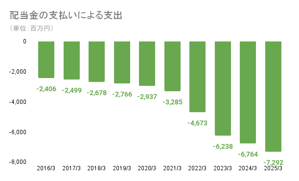 配当金の支払額は常に増加しています。株主還元意識は評価できる一方で、2025年3月期には減配をしているのにもかかわらず支払い額が増加しているのは三菱UFJ銀行への第三者公募増資の影響が大きく、「増資」というものの影響力を感じさせられます。