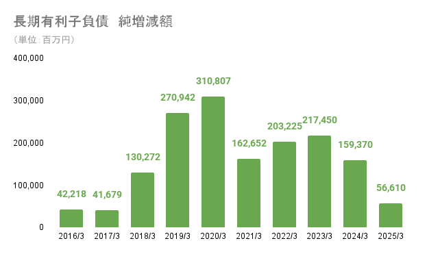 本記事では「長期有利子負債の純増減額」に関して、財務キャッシュフローにおける「長期借入金の純増減額(収入-支出)」と「社債の純増減額(収入-支出)」、「債権流動化借入の純増減額(収入-返済)」の合計と定義しています。