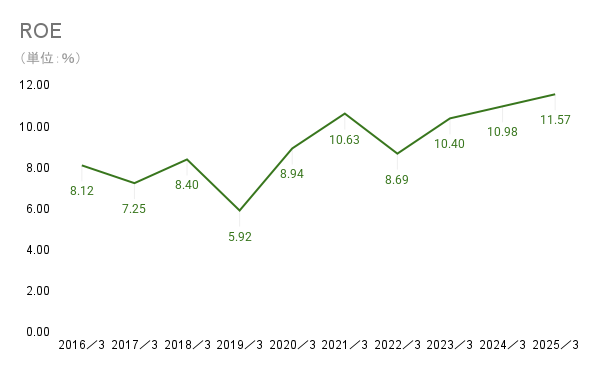 ROEは8%を超えることが多く、高収益・高効率といえます。基本的には純利益率主導のROE上昇と考えられますが、借入をして財務レバレッジを高める事もあります。そのため今後急激なROE上昇があった場合には、ROE上昇の健全性は調べる必要があると考えられます。