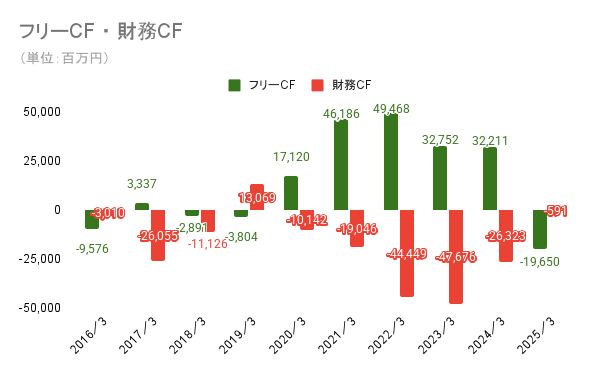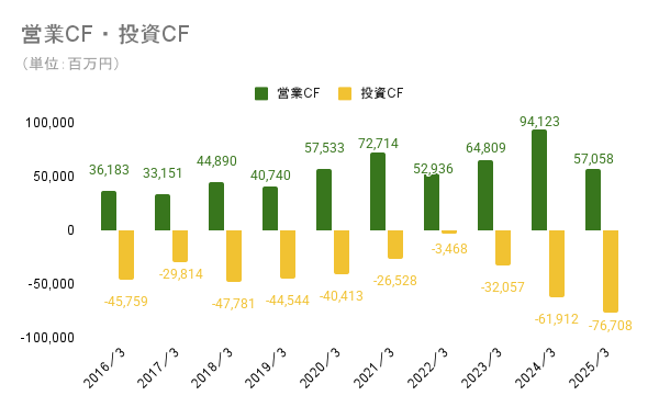投資CFのキャッシュアウトは多くが工場などの有形固定資産の購入によるものです。2024年3月期と2025年3月期には、米国サウスカロライナ州に米国3番目の生産拠点を作るために合計1,300億円以上の設備投資を行っています。関税リスクが存在する中で米国内の生産拠点が充実することでコストを抑えることができるため、新工場が米国事業の回復の要因になることが期待されます。