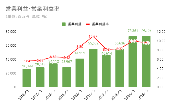 一方で、営業利益は、2022年3月期や2023年3月期に一時下落をしています。これは減価償却費の増加原材料費の高騰を受けたためです。その後は価格転嫁を実施できて営業利益は回復しましたが、現在でも全世界的なインフレが続くため減益する可能性を考慮する必要があると考えられます。