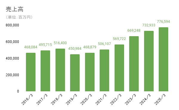 売上高は右肩上がりを続けており、景気に左右されない強みが出ている業績です。近年は全世界的なインフレの影響を受け、国内外で値上げを行ったことで売上が増加していると考えられます。また、値上げにより増収を達成しているのはブランド価値によって値上げ後も販売数が急減しなかったことを示し、日清のブランド力の強さを示す物だとも考えられます。