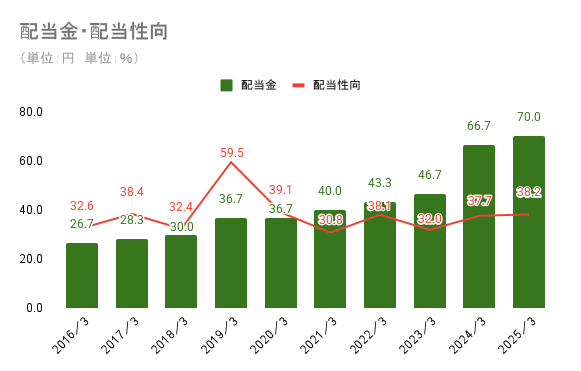 配当金は2000年度から累進配当を続けています。中期経営計画でも配当性向40%を目安に累進的な増配をすることを明言しており、長期保有に向いている銘柄であると考えられます。