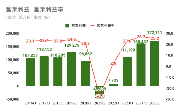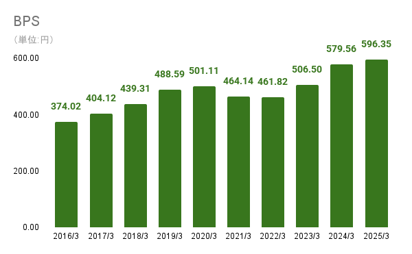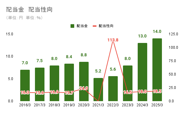 EPSも増加傾向にあります。特に2025年3月期には約618億円(1800万株)の自社株買いを実施しており、1株当たりの価値を高める企業努力が見受けられます。配当金の還元方針は配当性向ベースであるため、EPSの上昇がストレートに還元の拡大に繋がります。