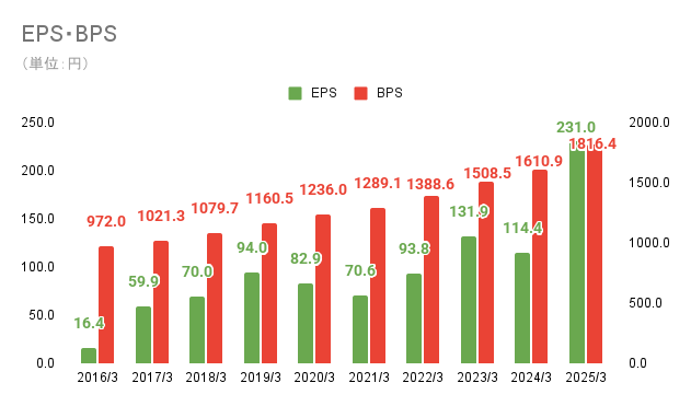 EPSも断続的な右肩上がりをしています。2025年3月期が大幅に上昇していますが、不動産売却益による特別利益の増益が一部加わっている点は考慮する必要があります。近年は自社株買いも積極的に行っているため、今後更なるEPS上昇に期待できます。