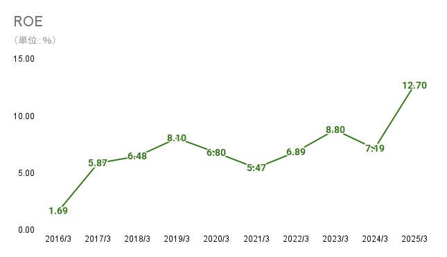 ROEは5~8%台で移動しています。2025年3月期は、不動産の売却益による純利益率の上昇やきずなHDの経営統合による財務レバレッジの上昇でROEが向上したと考えられます。新中期経営計画(2025年度~2027年度)では中長期的なROE8%以上を目指すことを公表しており、今後M&Aをしつつも利益率を下げずに安定したROE向上を出来ることを期待したいです。