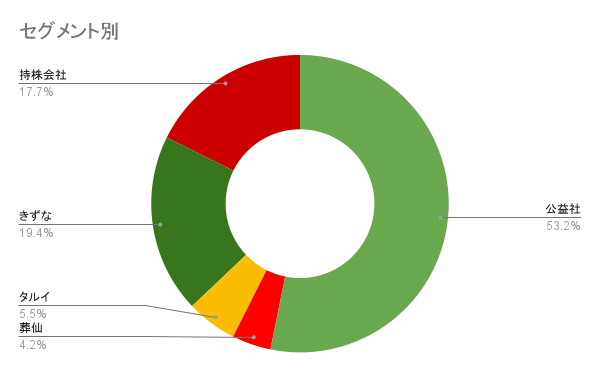 最も大きな割合を占めているのは公益社セグメントで、売上の半分以上を占めています。近畿や首都圏で比較的大規模な葬祭を行うため、単価と件数がともに大きくなり最も大きな割合を占めていると考えられます。