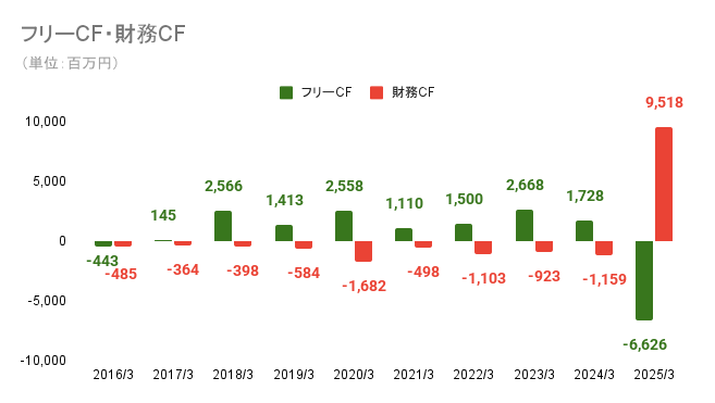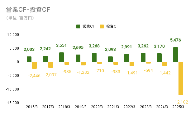営業CFは波打ちながら横ばいに推移しています。売上高との相関性が高く、売上の上昇がキャッシュの増加に繋がることが多いです。2025年3月期はきずなHD要因もあり増加しており、営業CFの前年比増加率に関しては売上高の増加率よりも大きいです。売上高同様、今後の右肩上がりの成長を期待したい指標のひとつです。