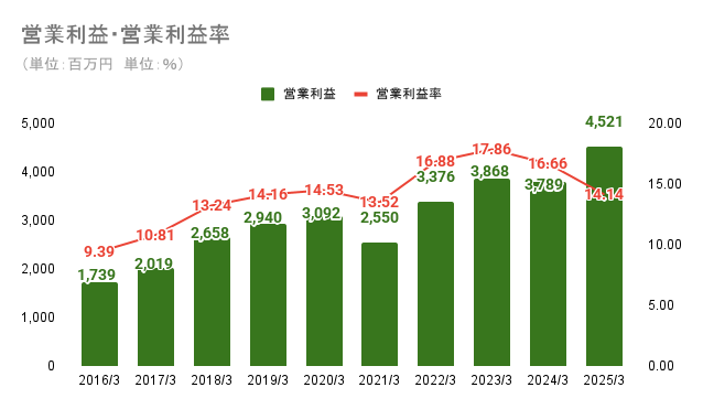 営業利益率は右肩上がりの成長を断続的に続けています。営業利益率が前年比で下落している理由として挙げられるのは、2021年3月期はコロナ禍による売上減と固定費による利益の圧迫です。また、2024年3月期は主に公益社で人件費と広告宣伝費が増加したことが挙げられます。2025年3月期はきずなHDの経営統合により、全体での単価の減少や販管費にのれん償却を計上した点が挙げられます。今後もM&Aを続けることで増収増益は見込まれるものの利益率の面では不安定になるリスクがあるため利益率は特に注視する必要があります。