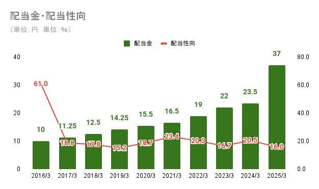 配当金は連続増配をしています。加えて、新中期経営計画では株主還元として累進増配を発表しており、企業価値の向上に取り組んでいると考えられます。