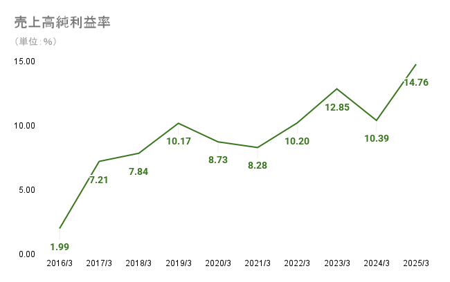 純利益率は増加傾向にあります。2025年3月期は不動産売却による純利益率の上昇があり、大幅な上昇をしています。