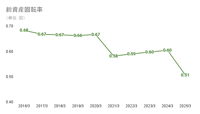 2025年3月期はきずなHDのM&Aによるものであると考えられます。きずなHDの統合によって総資産回転率が押し下げられました(きずなHD 2024年度総資産回転率約0.36回)。
