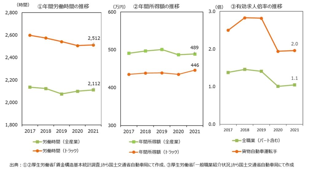 現状、トラックドライバーは全産業と比較して年間労働時間は約2割長く、年間所得は約1割低く、有効求人倍率は約2倍と高い状態にあります。