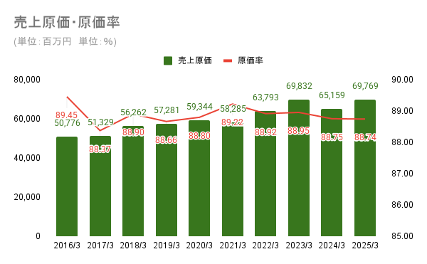 売上原価率は横ばいの推移をしています。そのため、売上高の増加に対応して売上原価も増加していることが分かります。