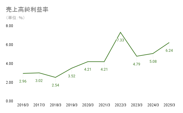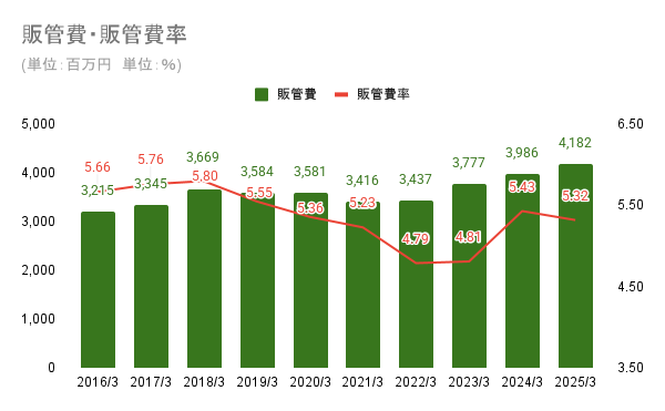 一方で、販管費率は2018年3月期から2022年3月期まで継続的に下がり続け、その後も比較的低水準で維持がされています。コロナ後は、エネルギー価格の高騰と高止まりが続き、2023年頃からは国内でのインフレがトレンド化や労務費の増加などが起き、更なる物流コスト増が起きました。その中で販管費率を抑えられているのは澁澤倉庫の企業努力の賜物であると考えられます。
