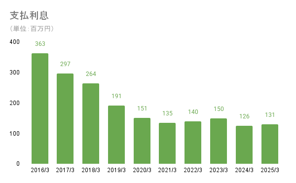 有利子負債自体が減少傾向にあり、それに応じて支払利息も減少し続けています。