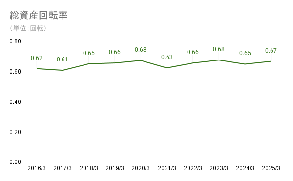 総資産回転率は横ばいを続けています。資産効率自体は向上していないことが分かります。
