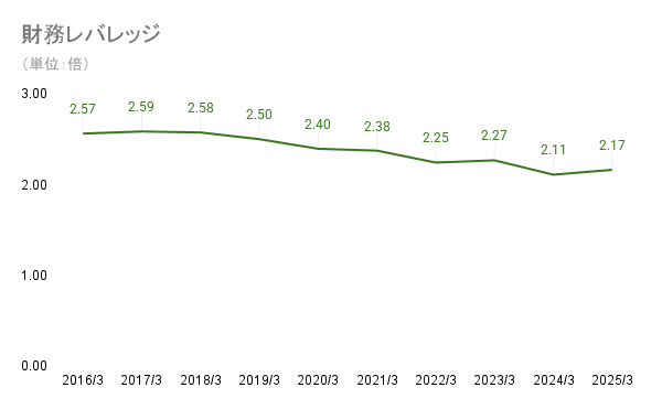 財務レバレッジは下がっています。負債総額は直近10年間であまり変わっていない一方で、純資産額(または株主資本)は増加を続けています。これは常に利益を出し続け、内部留保を多く積み重ねていったためです。そのため、相対的に財務レバレッジは小さくなっていきました。